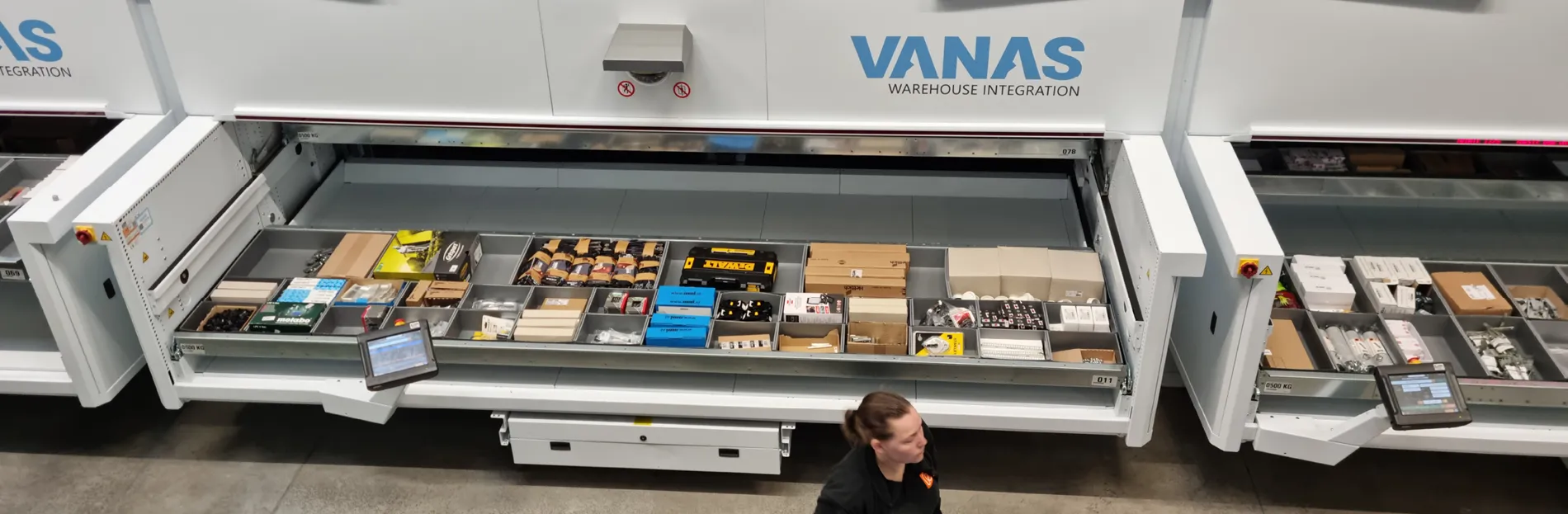 Vanas ontwierp een schaalbaar logistiek concept waarbij verticale liften, een mezzanine en een slimme sorteeroplossing naadloos samenwerken. De kern van de oplossing bestaat uit een pick-and-pass configuratie met zeven liften, gekoppeld aan een mezzanineverdieping.